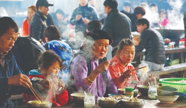 La zone réservée à la restauration est toujours bondée, avec des beignets à base de farine de riz ou de maïs, du thang cô (soupe d’entrailles de bovidés, typique des H’mông), ainsi que le classique pho (soupe de nouilles à la viande de bœuf ou de poulet), un plat familier pour tous les Vietnamiens, mais préparé avec des ingrédients locaux.